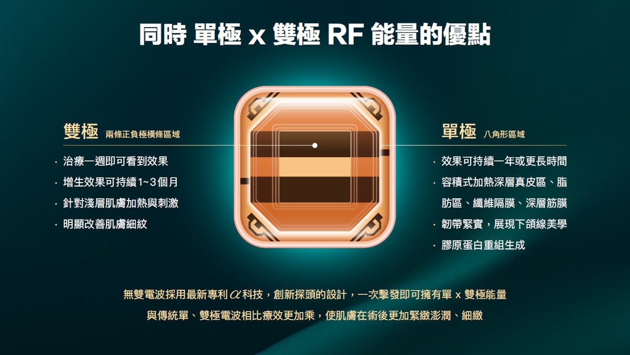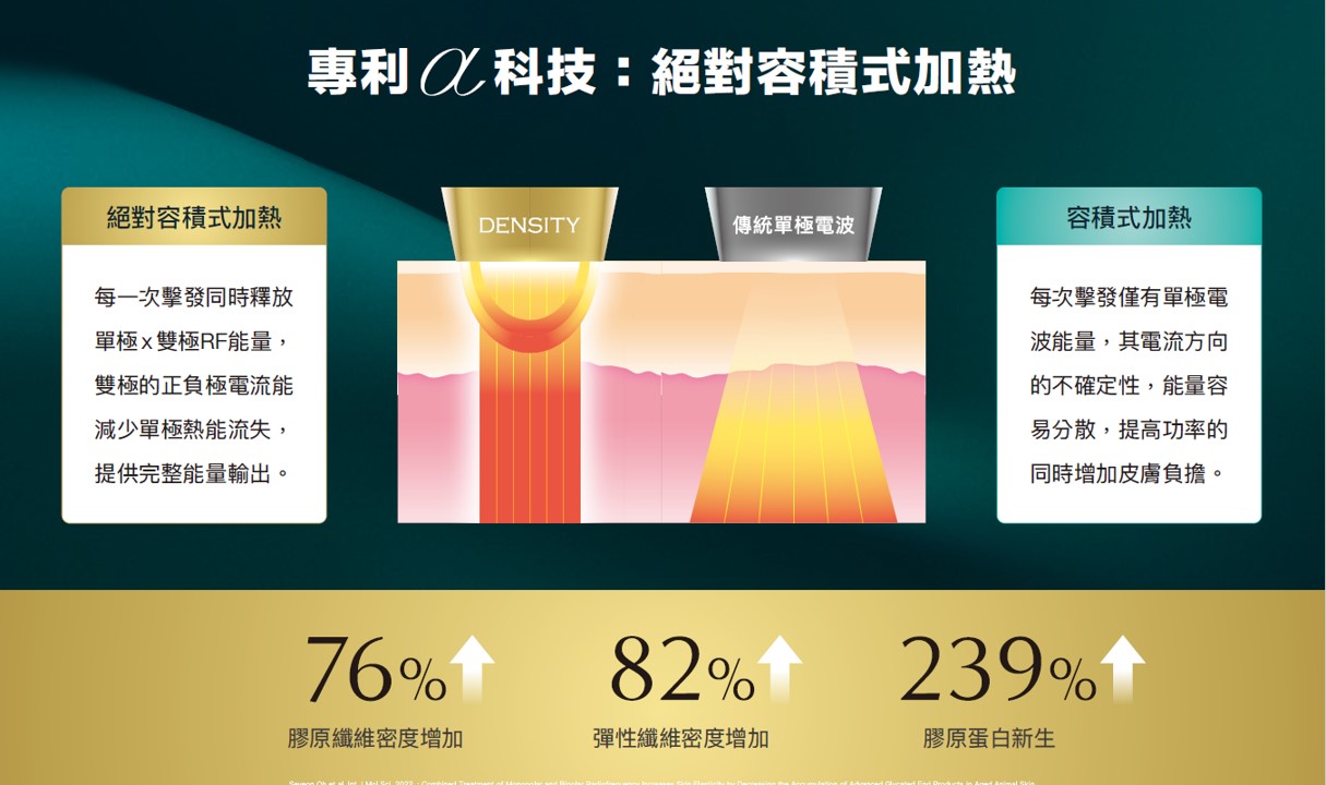 當醫美不再只是「做了什麼」,而是回到能量是否精準、層次是否正確、過程是否值得信任,緊膚療程,也進入了新的標準。無雙電波(DENSITY)憑藉其專利 αLPHA 交替脈衝加熱技術,突破傳統單一電波僅能作用於單一層次的限制,透過 單極 × 雙極電波的結構式設計,同時兼顧深層支撐與表層膚質重建。這項榮獲亞洲設計大獎肯定的技術,不僅代表儀器創新,更象徵著—皮膚緊緻,正式走向「精準分層管理」的時代。
