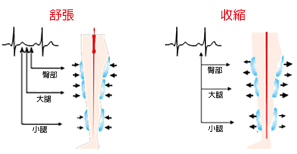 ①當心臟放鬆(舒張期),氣囊從腳部往心臟方向依序加壓,幫助血液快速回流;